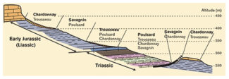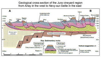The entire Jurassic era was, in fact, named for tiny Jura; the region’s limestone mountains are representative of the geological developments which occurred around 200 million years ago, and the vine-friendly soil types that predominate here are Jurassic period limestone and marl. About fifty miles north to south, elevations in the appellation vary widely, from the mountainous east, where the topography may reach forty-five hundred feet to the flatter west. The majority of the vines are planted in the Jura are restricted to south-facing slopes in lower-lying land in the west, where the elevation tops out at a thousand feet.