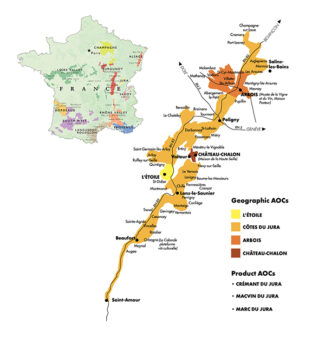 Five distinct AOPs subdivide the Jura; the most important in terms of volume are Arbois and Côtes du Jura, with Crémant du Jura, Macvin and L’Étoile rounding out the quintet.