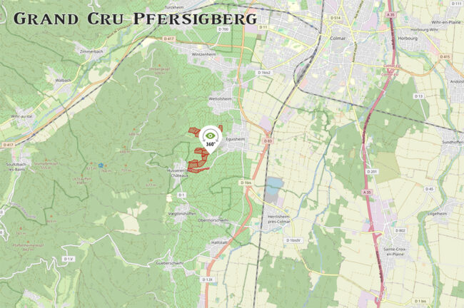 Straddling the communes of Eguisheim and Wettolsheim, Pfersigberg is one of four Grand Crus which run in a line just to the south-west of Colmar. The third-largest Alsace Grand Cru, at 184 acres, it also is a land of gentle slopes, unlike the nearly unmanageable vineyards of Zinnkoepfle and Rangen.