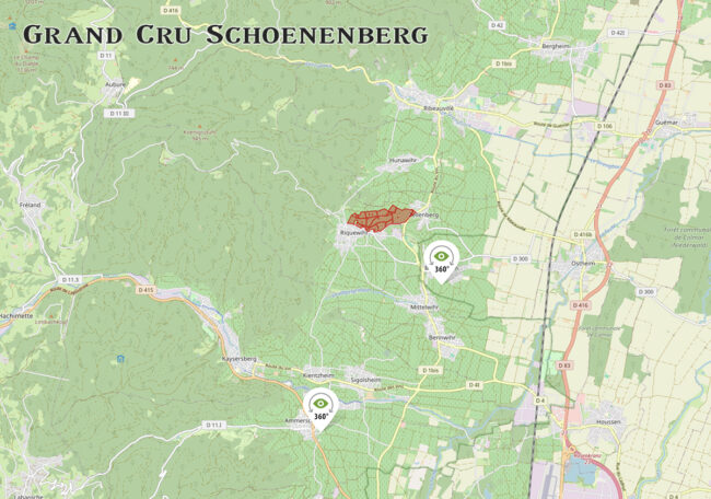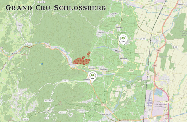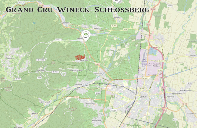 About five miles from Colmar, Schlossberg overlooks the Weiss valley from the outskirts of the town of Kientzheim up to the medieval Kaysersberg castle. The 150-acre Grand Cru sits on very steep hillside. The lieux-dits, therefore, are covered by a succession of terraces between 750 and 1300 feet in altitude, with the majority facing due south on the Bixkoepfel hillside, with a small detached portion looking towards the east.