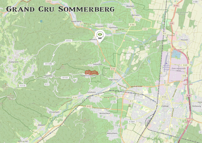 Sommerberg stretches over the foot of the Trois-Épis mountain to the south of Katzenthal and to the north of Niedermorschwihr. Located on a 45° angle hill oriented directly to the south, Sommerberg covers 69 acres overlooking Niedermorschwihr. The slopes rise steadily to 1310 ft. and so are amongst the steepest in Alsace, rivaling even the severity of the volcanic hillside of the Rangen Grand Cru.